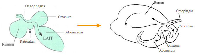 Başlangıcta, buzağılar tek midelidirler. Buzağılar süt ve buzağı maması sindirebilirler ancak bitkisel lifleri sindiremezler.